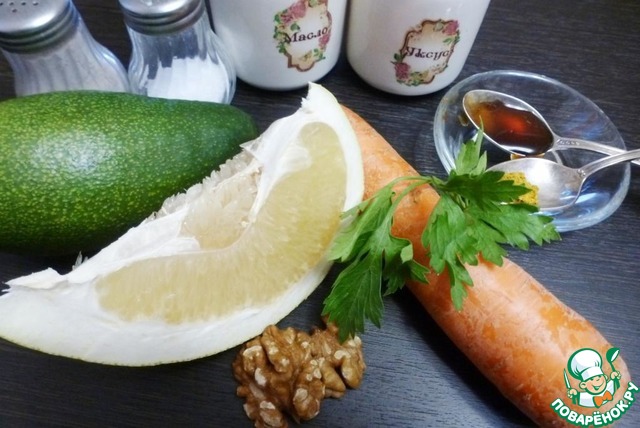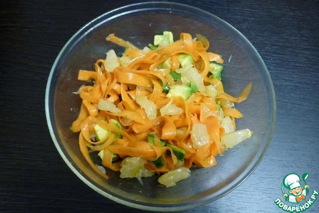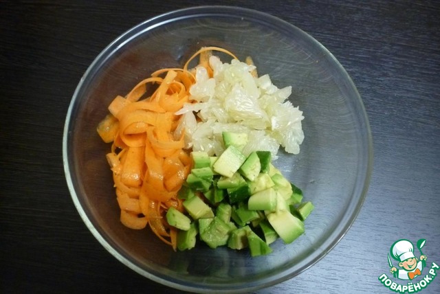Соединить в миске морковь, кусочки помело и авокадо. -