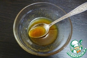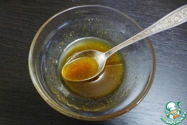Смешать растительное масло, винный уксус, мед, карри, немного посолить и поперчить.