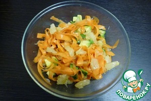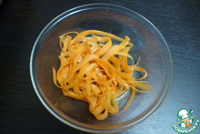 Морковь почистить и нарезать с помощью овощечистки на длинные полоски. Полить половиной заправки и перемешать.