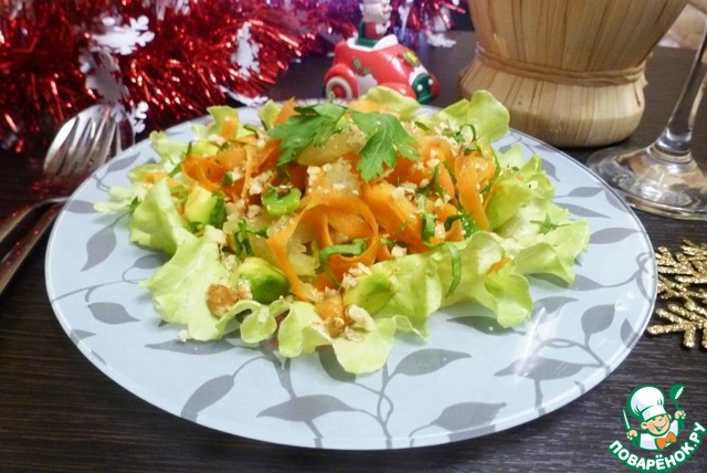 Замечательный салат из моркови сочный, вкусный, хрустящий и, главное, полезный, а ещё он без майонеза! Кроме морковки там нежный авокадо, кисло-сладкий помело, хрустящие орешки. Такой салат понравится вегетарианцам, ведь у них тоже праздник, да и в Пост такой салат будет актуален.