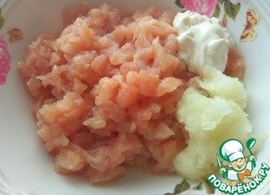К нарезанному мясу добавить лук, соль и 1 ст л сметаны. Перемешать. -