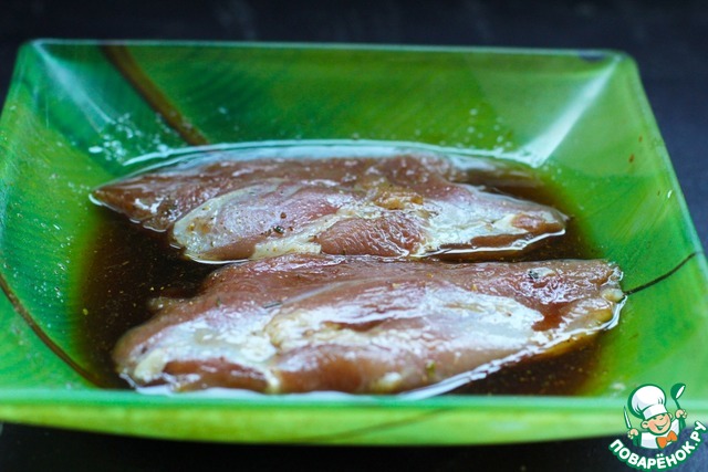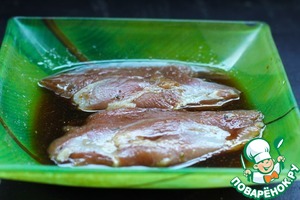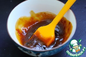 Приготовить маринад, смешав кунжутное масло, соевый соус и мед. Филе замариновать 30 минут.