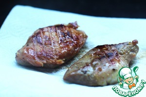 • Далее разогреть гриль. Филе обсушить. Поместить под гриль на 4-5 минуты, переворачивая, если гриль не контактный. Утка завернуть в фольгу, сохраняя теплой.