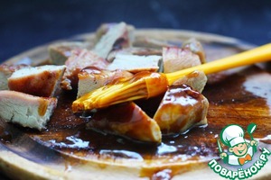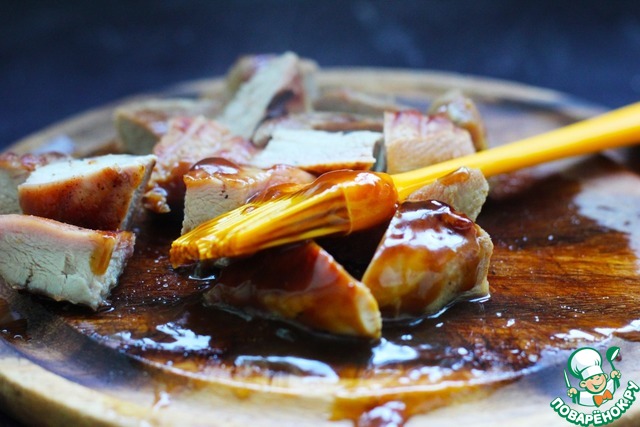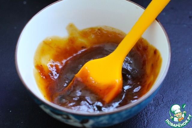 • В маленьком сотейнике смешать апельсиновый сок с крахмалом, добавить весь маринад и уварить до загустения. Снять с огня.