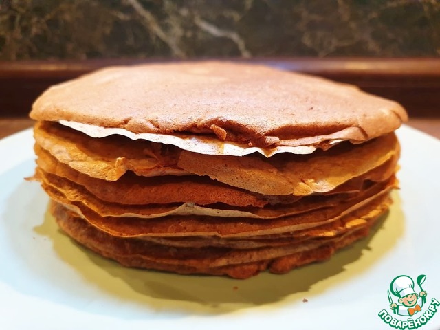 Последний блин ничем пока не покрываем. Я обычно ставлю дно от разъемной формы на верхний блин и придавливаю небольшим грузом.