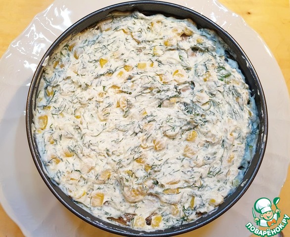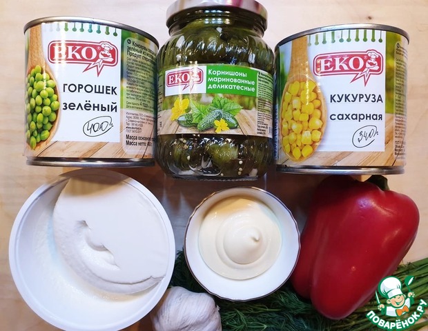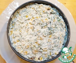 Слои делайте на свое усмотрение. У меня в таком порядке: с корнишоном, с перцем, с горошком, с кукурузой.
