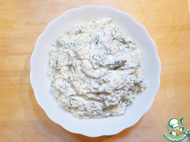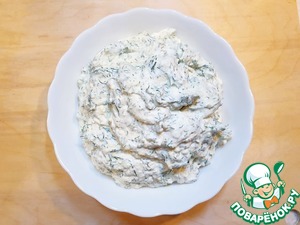 Творжный сыр смешиваем с майонезом, нарезанным укропом, измельченным чесноком, подсолим.