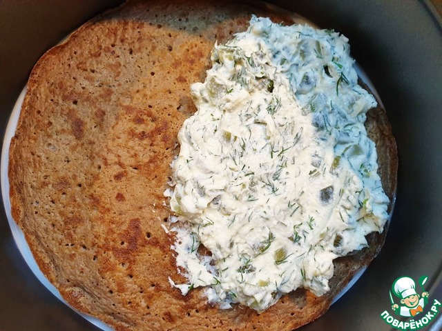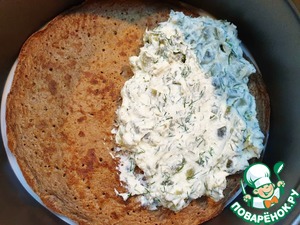 Кладем печеночный блинчик, сверху половину одной из начинок, разравниваем по всей поверхности.