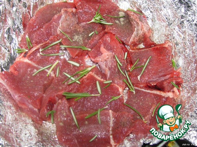 Форму выложить фольгой. Мясо слегка посолить и поперчить, выложить в форму и посыпать розмарином (я просто оборвала листочки с веточек и слегка растёрла их в руке).