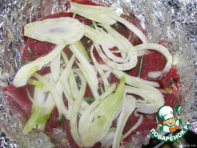 Фенхель и лук нарезать пластинками, выложить на мясо. Я шаг с луком не сфотографировала (забыла!!!).