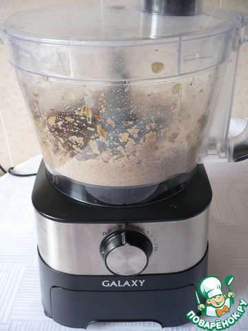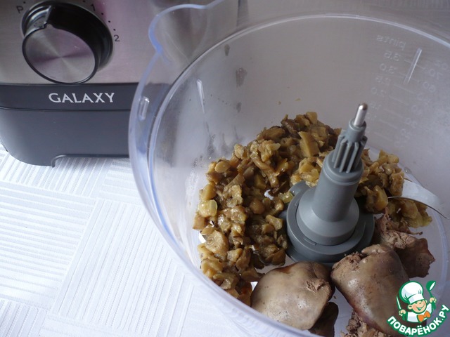В чашу кухонного комбайна GALAXY GL2300 выложила отваренную куриную печень и обжаренные с луком грибы. Всю массу хорошо измельчила кухонным комбайном на 1 скорости.