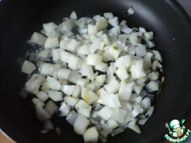 Ставим на огонь сковороду. Наливаем растительное масло и высыпаем измельченный лук.