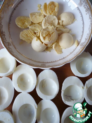 Яйца отварить и почистить. Затем аккуратно разрезать пополам, разделить на белки и желтки.