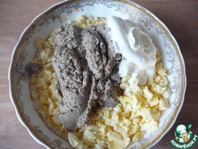 Добавить в желтки измельченную печень с грибами и майонез. Все хорошо перемешать.