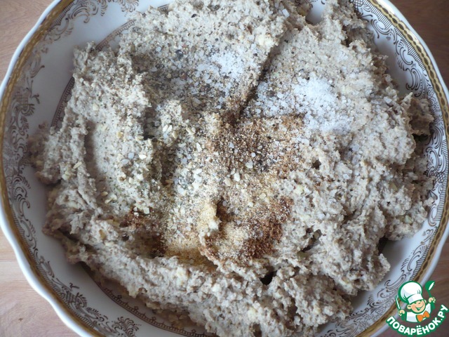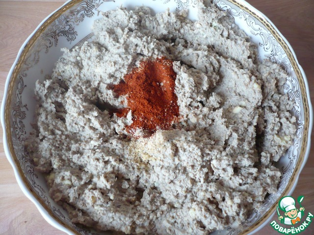 В приготовленную начинку добавляем специи: молотый мускатный орех, молотый кориандр, сушеный чеснок, черный молотый перец и соль по вкусу. Хорошо все перемешиваем.