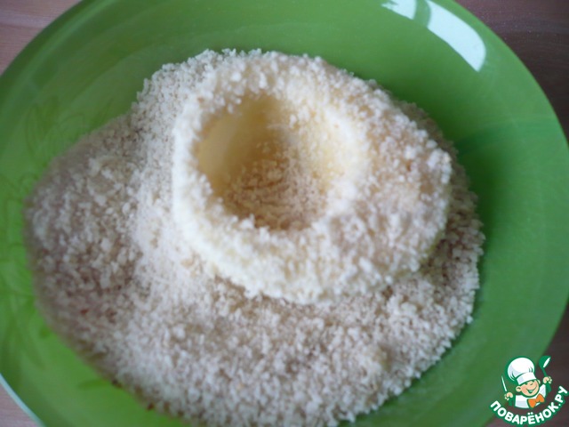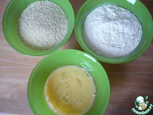 Для панировки белков приготовьте три миски: одну с пшеничной мукой, вторую с панировочными сухарями и третью со взбитым яйцом.