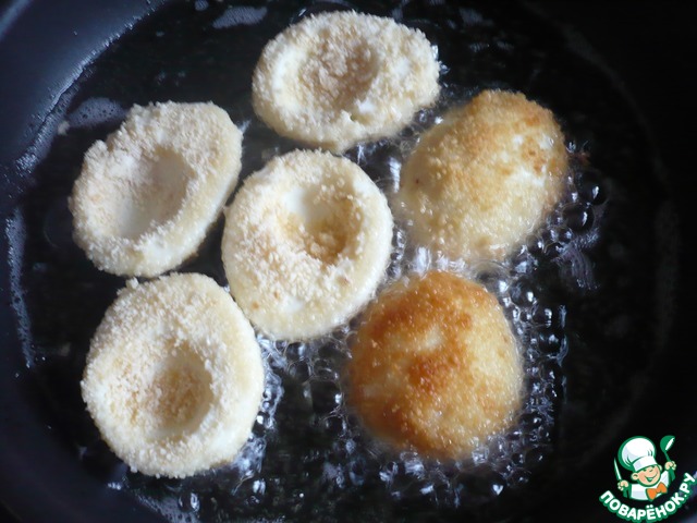 Включаем сковороду и наливаем в неё растительное масло для фритюра. Аккуратно выкладываем белки в панировке в хорошо разогретое растительное масло и обжариваем. Когда яйца обжарились с одной стороны, переверните их на другую. Так обжариваем все яйца до золотистого цвета.