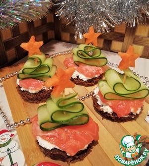 Сверху на бутерброд с сыром кладем красную рыбу. При помощи зубочистки из огурца формируем елочку, украшаем ее звездой (вырезанной из моркови).