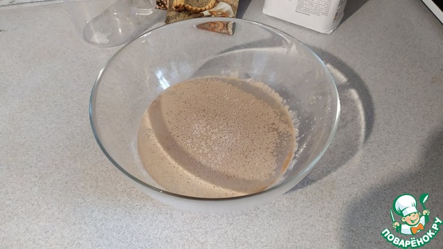 Добавить 50 г ржаной и 70 г пшеничной муки. Перемешать. Накрыть полотенцем и поставить в теплое место на 20 мин., чтобы опара подошла.