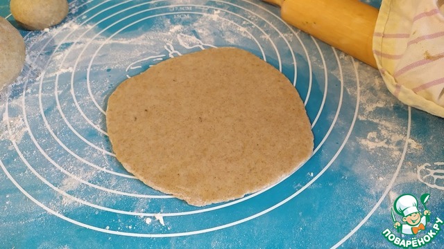 Взять 1 колобок и раскатать его в лепешку. Смазать лепешку растительным маслом. Сложить пополам.