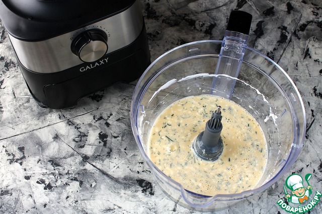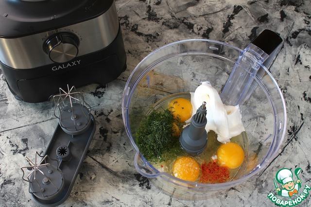 Яйца, сметану, соль, перец и зелень положить в чашу комбайна GALAXY GL2300 -