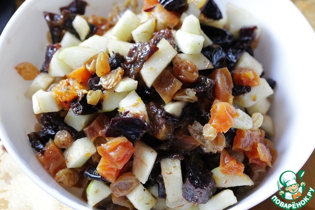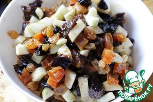 Яблоко, курагу и чернослив нарезать на мелкие кубики, добавить изюм, залить яблочным соком (или портвейном) и оставить на час.
