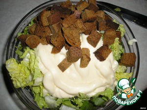 Сухариков из чёрного хлеба - две щепотки. У меня душистые сухарики без всяких специй. Сметанку или майонез.