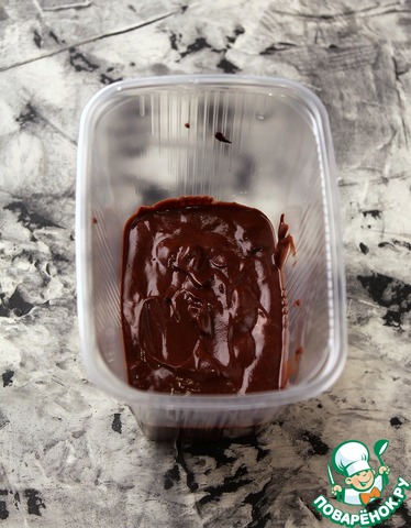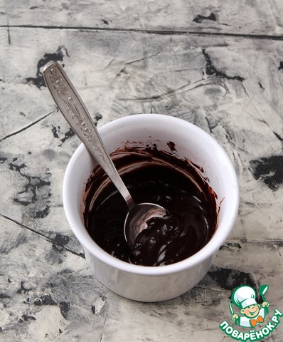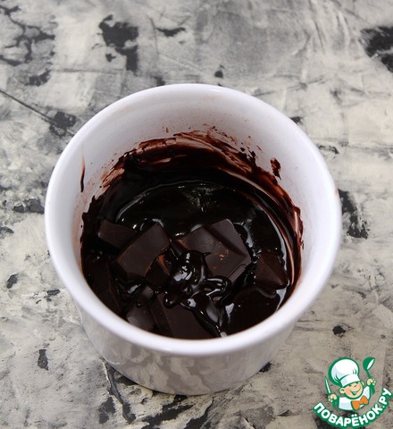 Добавить шоколад. Импульсами по 10 сек, растопить шоколад в микроволновой печи.
