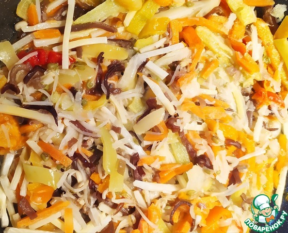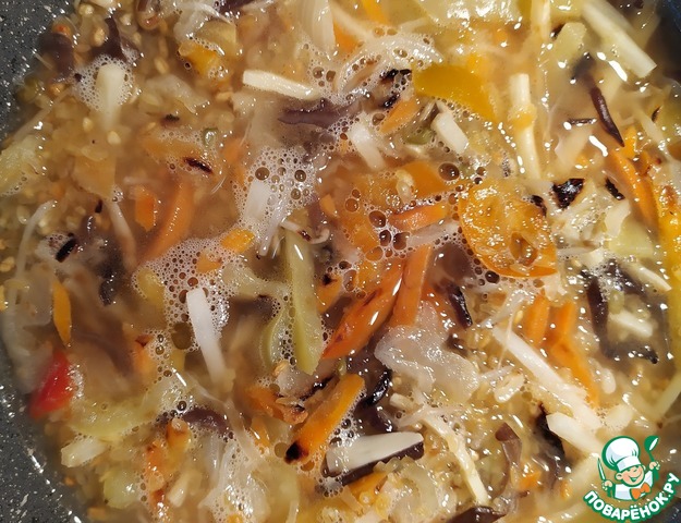 • Затем залить все горячей кипяченой водой. Накрыть сковороду крышкой и тушить на небольшом огне около 15 минут пока жидкости в сковороде почти совсем не останется.