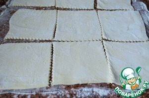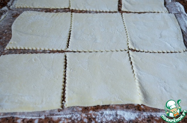 Тесто раскатать, нарезать на 9 квадратов, 9-12 см.. -