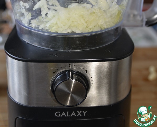 Начинаем с приготовления начинки. Лук чистим и измельчаем, я использовала для этого шинковку кухонного комбайна GALAXY GL2300.