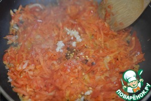 Добавляем порезанный перец, кладём соль, сахар, хлопья перца чили, выдавливаем чеснок, перемешиваем. Тушим на среднем огне около 5 минут.