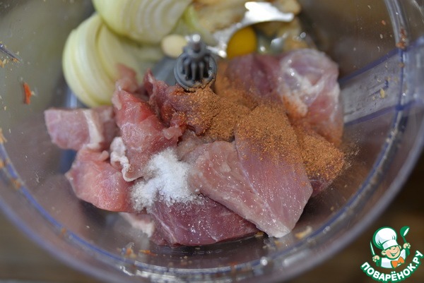 Готовим фарш. В чашу комбайна кладём порезанную свинину (у меня окорок), хлеб (у меня чиабатта собственного приготовления), яйцо, чеснок, порезанный лук, соль, смесь перцев. Измельчаем в фарш. Я использовала ножи кухонного комбайна GALAXY GL2300.