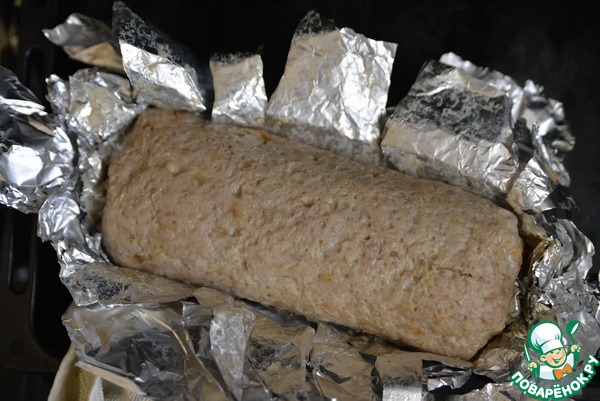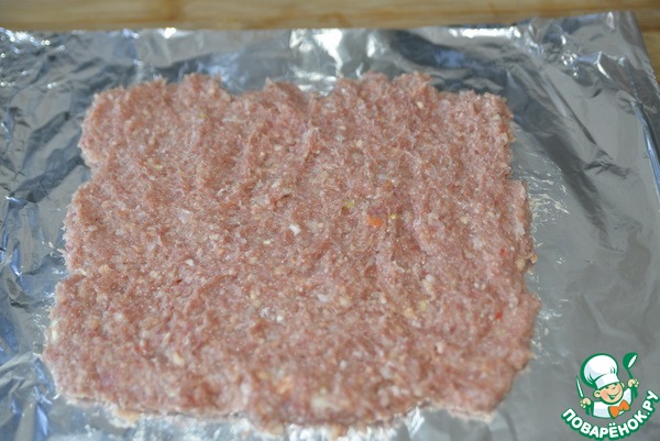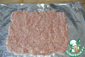 Берём фольгу, складываем вдвое, кладём сверху слой фарша толщиной около 1,5-2 см, разравниваем в прямоугольник.