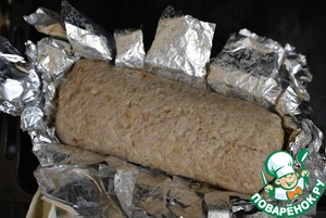 Сворачиваем фарш с начинкой в рулет, защипываем края.