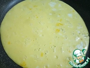• Сковороду слегка прогреваем, можно как бы протереть салфеткой, смоченной в растительном масле, но не наливать масло в сковороду. Наливаем нашу яичную массу и выпекаем под крышкой, на очень медленном огне блинчик. Когда верх тоже схватится, мы не переворачиваем, а просто выкладываем на блюдо. С оставшимися молоком и яйцами выпекаем второй "блинчик".