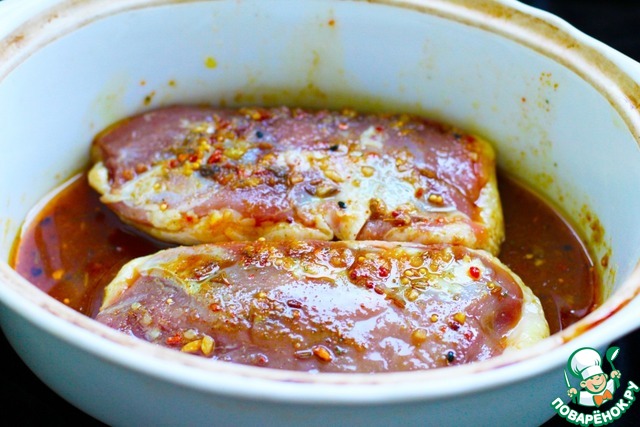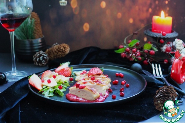Замаринованное в медово-чесночном маринаде с травами филе с соусом из сезонных ягод, дополненное свежей клубникой и гриллованным сыром бри - что может быть изысканней...