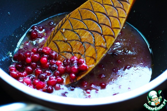 Для приготовления соуса довести до кипения вино с яблочным соком и крахмалом. Добавить ягоды и мед.