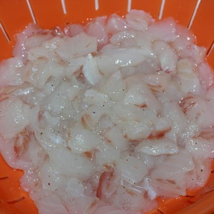 Филе нарезать кубиком. Добавит соль, перец, глутамат натрия и сок четвертинки лайма.