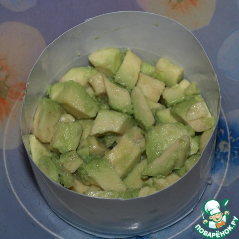 В кулинарное кольцо (у меня вырезано из пластиковой бутылки) выложить авокадо.
