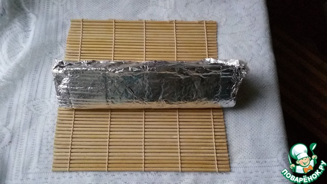 Мне удобно формировать с помощью коврика для суши. На него кладем фольгу с пленкой. Выкладываем подготовленную массу в виде прямоугольника ≈ 22 ×17 см и высотой 1,5-2 см.