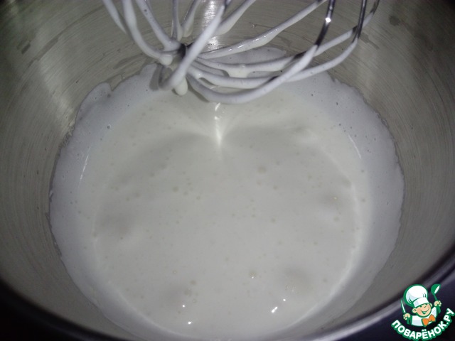 6. А пока бисквит остывает подготовим глазурь. Взбейте вручную или с помощью блендера (миксера) белок, пока он не станет белоснежным.