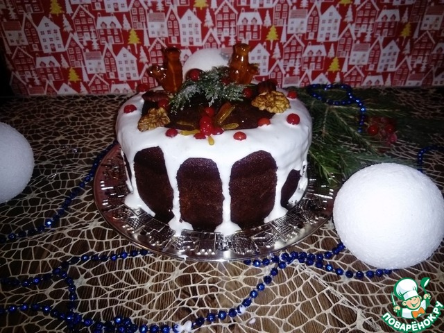 7. Начинаем украшать рождественский кекс. Вы можете украшать по своему желанию. Я украшала белковой глазурью, ягодами клюквы, грецкими орехами, карамелью на палочки и еловыми веточками. И вот что у меня получилось.