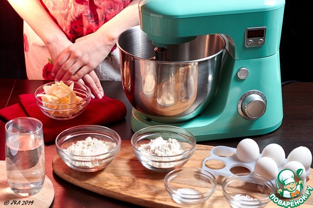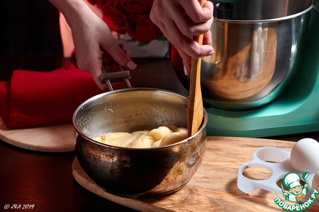 Тесто остудить до температуры 35-40 С. Переложить в чашу миксера или миску. Начинаем добавлять яйца по одному, наблюдая за консистенцией. Как только первое яйцо вмешалось, добавляем второе и тд.