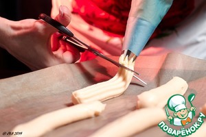 Готовый крем положить в пленку и скатать колбаску. Положить в холодильник на стабилизацию. Потом просто отрезать один усик, а эту колбаску положить в мешок с насадкой. Кстати, с тестом я проделала такой же трюк. Удобно - мешок не пачкается.