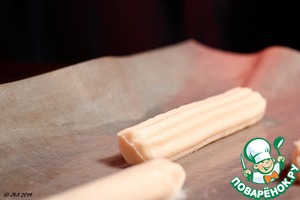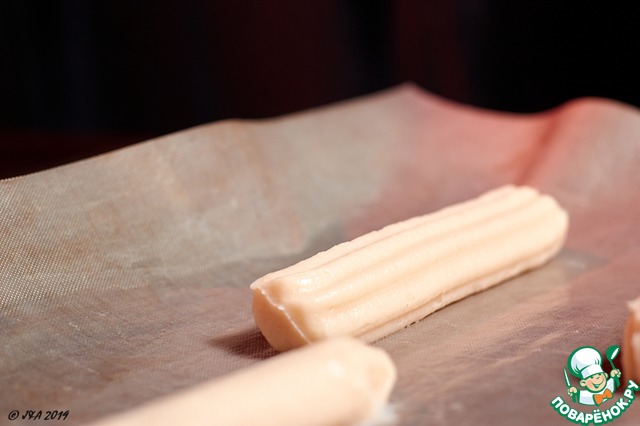 Выложить тесто в мешок с насадкой французская звезда диаметром 14 мм. Моя заготовка провела ночь в холодильнике. Говорят - так в тесте развивается глютен и оно делается еще лучше. У меня опыт небольшой, я экспериментировала, но отсаживать их и правда было легче, чем свежее тесто.