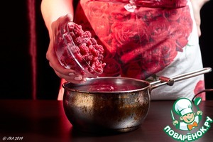 За это время займемся кремом. Возьмем замороженную малину. Выложить ее в сотейник и довести до кипения.