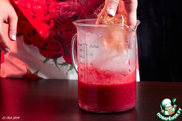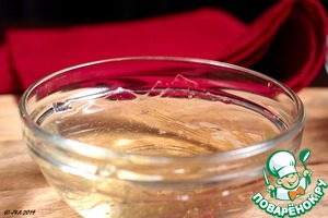 Желатин замочить в ледяной воде. Если листовой- то в произвольном, он сам возьмет нужное количество жидкости. Если порошковый- то пропорция 1:6- на 10 гр желатина- 60 мл воды.