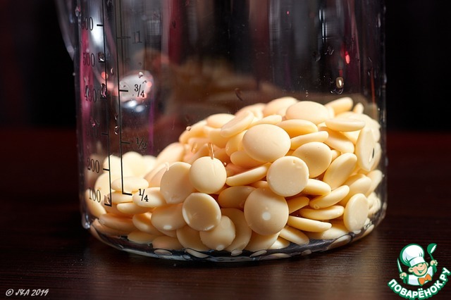 Подготовьте белый шоколад. порубите его максимально мелко. Или возьмите готовый в каллетах.