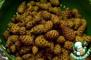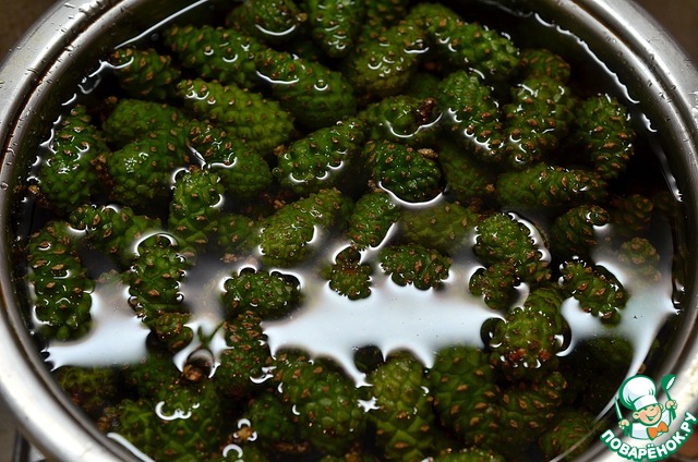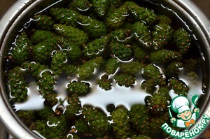 Шишки переберите. Рекомендую пользоваться резиновыми перчатками, иначе руки потом отмыть будет сложно. В кастрюле с толстым дном залейте шишки водой, чтобы она полностью покрывала их. Доведите до кипения и варите на небольшом огне 40 минут.